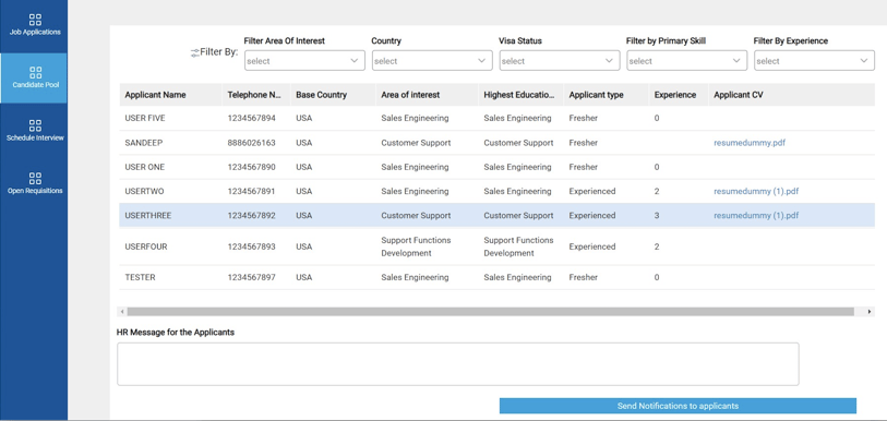 แอพนี้ครอบคลุมกระบวนการโดยรวมของการสมัครงานสำหรับทั้งผู้สมัครและองค์กรที่ว่าจ้าง ประกอบด้วยแดชบอร์ดผู้ใช้สำหรับผู้สมัครเพื่อส่งใบสมัคร แดชบอร์ดทรัพยากรบุคคลเพื่อคัดกรองและเลือกผู้สมัคร และแดชบอร์ดผู้สัมภาษณ์เพื่อบันทึกรายละเอียดของการสัมภาษณ์ แอปนี้มีเวิร์กโฟลว์หลายขั้น