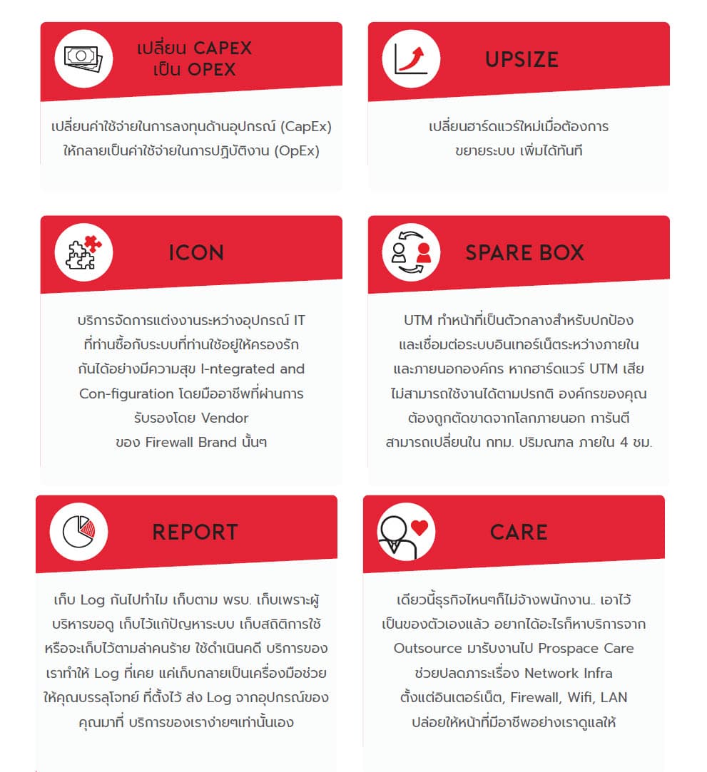 Firewall นั้นแพงเป็นแสนหรือหลายแสนจ่ายเป็นเงินก้อน กระทบ cash flow ตามมาต่อด้วยการออมทรัพย์สินที่ตัดค่าเสื่อมได้แค่ 20% ถือเป็นการจ่ายเงินสดที่เสียประโยชน์ทางภาษีในขณะที่ Firewall as a Service ออกแบบมาด้วยความเข้าใจเรื่องพวกนี้แทนการจ่ายเงินก้อนใหญ่เปลี่ยนมาจ่ายเป็นค่าบริการ ตามงวด บริษัทได้ Firewall ไปใช้งานเหมือนกันเป๊ะ แต่ไม่ต้องจ่ายเงินก้อนใหญ่ ไม่ต้องรับภาระทรัพย์สิน ที่สำคัญทุกบาทที่จ่ายนั้นหักค่าใช้จ่ายได้ 100% ไม่ต้องรอข้ามปี